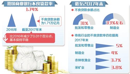 业内普遍认为,2018年银行业不良贷款余额、不良贷款率将与2017年基本持平,不良贷款形势总体上略有好转。当前,需要密切跟踪制造业、房地产业不良贷款增长规模和增长速度,有效防范化解相关风险
