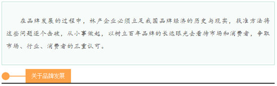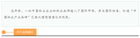 为加强林业品牌建设,落实《中共中央国务院关于开展质量提升行动的指导意见》《国务院办公厅关于发挥品牌引领作用推动供需结构升级的意见》《林业产业发展“十三五”规划》等要求,原国家林业局2017年12月提出了《关于加强林业品牌建设的指导意见》,印发了《林业品牌建设与保护行动计划(2017—2020年)》,强调要激发全社会参与林业品牌建设的积极性和创造性,使林业行业、企业品牌建设和保护意识显著增强,产品供给和质量水平明显提高,行业质量诚信和良好秩序基本形成,涌现出一批区域特色品牌、国内知名品牌和具有国际核心竞争力的林业品牌。品牌建设正在成为我国林业产业界开展生态文明建设、践行“绿水青山就是金山银山”理念的重点工作。