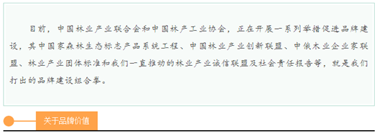目前,中国林业产业联合会和中国林产工业协会,正在开展一系列举措促进品牌建设,其中国家森林生态标志产品系统工程、中国林业产业创新联盟、中俄木业企业家联盟、林业产业团体标准和我们一直推动的林业产业诚信联盟及社会责任报告等,就是我们打出的品牌建设组合拳。