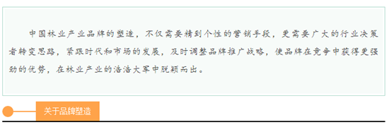 总而言之,中国林业产业品牌的塑造,不仅需要精到个性的营销手段,更需要广大的行业决策者转变思路,紧跟时代和市场的发展,及时调整品牌推广战略,使品牌在竞争中获得更强劲的优势,在林业产业的浩浩大军中脱颖而出。