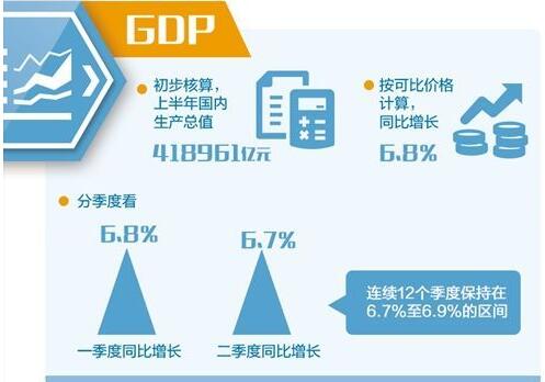 7月16日,国家统计局发布了2018年上半年主要经济数据。初步核算,上半年国内生产总值为418961亿元,按可比价格计算,同比增长6.8%。