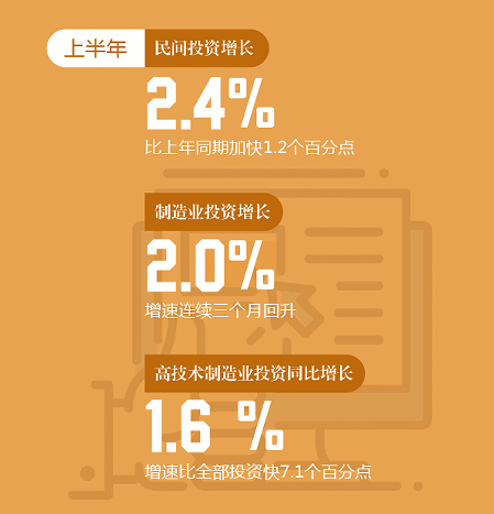 在消费转型升级的带动下,与消费直接相关的通信、文化体育娱乐和教育等领域的投资增长较快。上半年,文化、体育和娱乐业投资增长17.5%,增速比上年同期加快2.1个百分点;汽车制造业投资同比增长8.5%,计算机、通信和其他电子设备制造业投资增长19.7%,教育投资增长11.2%,均明显快于全国固定资产投资增速的平均水平。