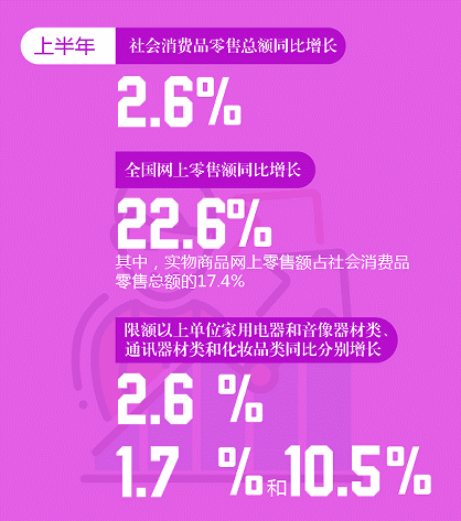 新兴业态保持快速增长的同时,传统零售业企业积极拓展销售渠道,继续保持较快增长态势。在大数据、人工智能和移动互联网等新技术推动以及日益完善的物流配送体系支撑下,超市、专业店等传统零售业态与电商平台深度融合,不断涌现出更注重消费者体验、集餐饮、购物、娱乐、休闲等跨界消费场景于一体的新零售业态。据测算,上半年,限额以上单位通过互联网实现的商品零售额占限额以上单位消费品零售额的比重为9.5%,比上年同期提升2.1个百分点;包括超市、百货店、专业店等在内的限额以上单位实体零售业态零售额同比增长7.6%,其中,限额以上单位超市、折扣店零售额增速分别比上年同期加快1.2和4.6个百分点,便利店和专业店保持10%左右的较高增速。