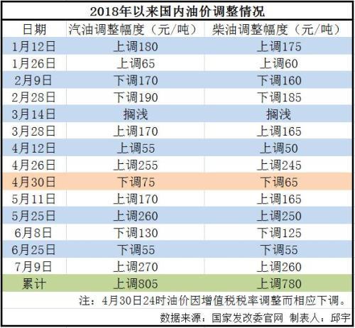 上一轮调价(7月9日)时,油价创下年内最大涨幅,汽油价格每吨上调270元,柴油价格每吨上调260元。随后,受多种因素影响,国际油价高位回落。