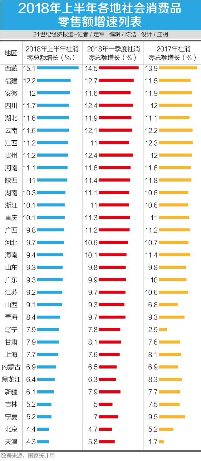 国家统计局数据显示,今年上半年社会消费品零售额增速最高的地区是西藏,达到了15.1%。此外,福建、安徽、四川、湖北、云南、江西、贵州等地的这一数据也较高,增速在11%以上。