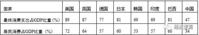 中国的居民消费占GDP的比重,不仅远远低于西方国家,如美国、英国、德国等;也显著低于与中国具有相似文化和传统的东亚国家,如日本和韩国等。事实上,34%这个数字甚至低于日本和韩国居民消费率的历史最低点:日本1970年为48.2%,韩国1998年为49%。印度、巴西和其他中等收入国家与中国的经济发展水平相当,但是这些国家的居民消费比率也超过了我们国家。