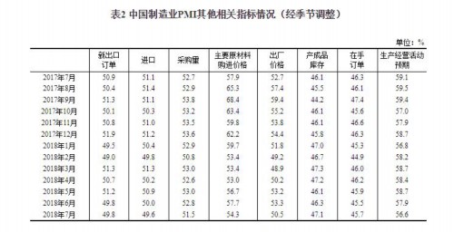 2018年7月,中国采购经理指数继续位于景气区间。受近期强降雨台风高温频发的影响,加之国际贸易摩擦升温和部分行业进入传统生产淡季等,采购经理指数出现一些波动,但运行基本稳定,我国经济总体继续保持扩张势头。