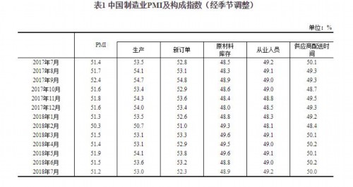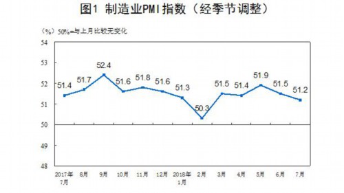 2018年7月份,中国制造业采购经理指数(PMI)为51.2%,比上月回落0.3个百分点,高于临界点,制造业继续保持增长态势。