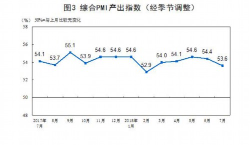 2018年7月份,综合PMI产出指数为53.6%,低于上月0.8个百分点,表明我国企业生产经营活动总体继续保持扩张,但步伐放缓。