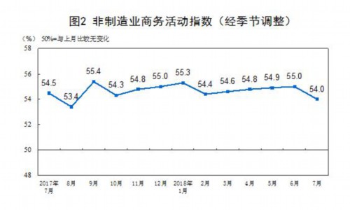 7月份,非制造业商务活动指数为54.0%,比上月回落1.0个百分点,连续11个月保持在54.0%及以上的较高景气区间,表明非制造业继续保持较快增长。