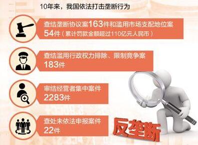 据统计,10年来,我国依法履行职责,注重发挥政府“有形的手”和市场“无形的手”作用,依法打击垄断行为,查结垄断协议案163件和滥用市场支配地位案54件,累计罚款金额超过110亿元人民币,查结滥用行政权力排除、限制竞争案183件,震慑了违法者,净化了市场环境;审结经营者集中案件2283件,查处未依法申报案件22件,有效预防市场垄断,维护市场公平竞争。