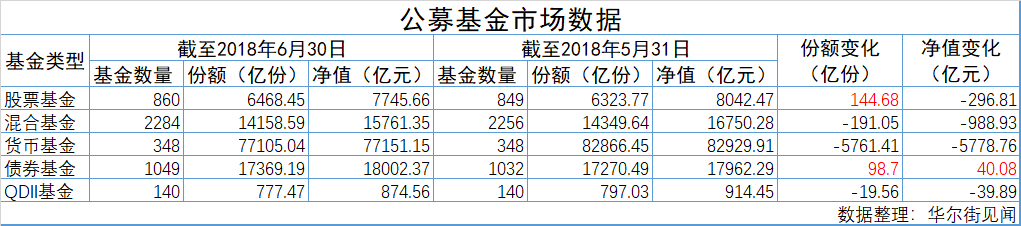 分类别来看,货币基金净值规模环比减少5778.76亿元,混合型、股票型、QDII基金净值规模也均有不同程度的降低,债券基金则“一枝独秀”,净值规模环比增加40.88亿元。但份额规模变化显示,股票基金和债券基金都有资金在加仓。