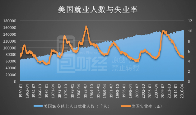 事实上,美国当下几乎处于历史上最低的失业水平。据美国劳工部数据,2016年12月美国整体失业率仅为4.7%(只比俄亥俄州高出0.3个百分点),与2010年相比下降近一半。而大西洋对岸的欧元区,2016年12月的失业率高达9.6%。下图为面包财经根据美国劳工部数据绘制的美国就业人数与失业率: