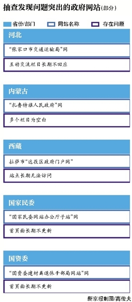 本次国办信息公开办抽查共发现16家政府网站存在突出问题。其中,国家林业和草原局“美丽中国网”、“国家民委网站办公厅子站”首页长期不更新,“国资委建材离退休干部局网站”首页长期不更新,且发稿日期造假。记者登录“美丽中国网”首页看到,“时报快讯”栏目推荐的3条新闻中有2条发表于2015年12月。