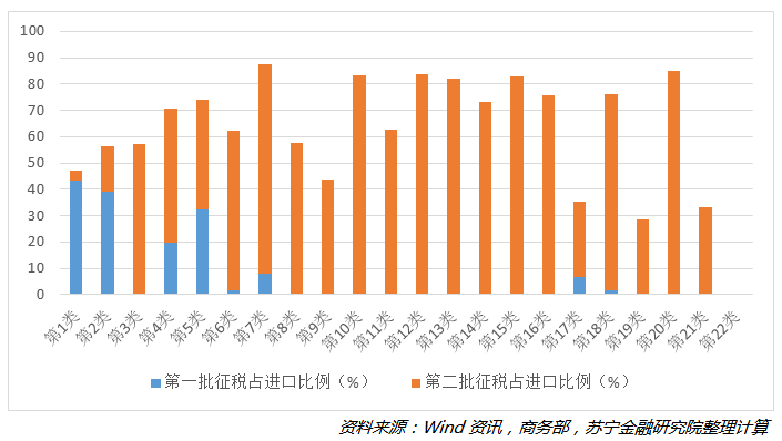 从商品清单看,我国第一轮征税清单主要集中在农产品、矿产品等,第二轮征税清单扩展至几乎所有行业。至此,加征关税涉及进口额已经占我国自美进口的71.5%,覆盖了绝大部分关税条目。