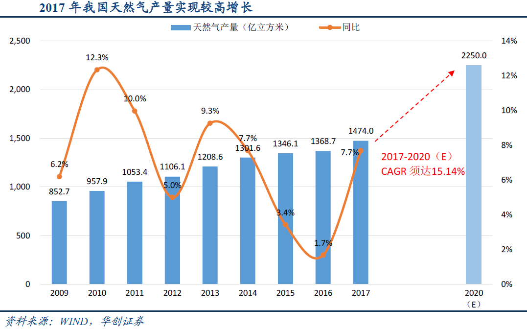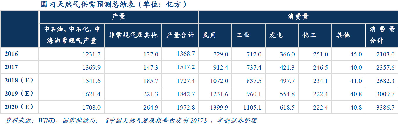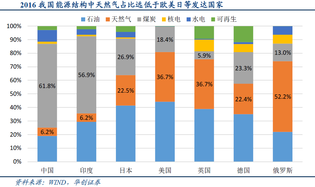 华创证券指出,当前国内能源结构中煤炭消费占比高达62%,而天然气6%的消费占比远不及世界24%的平均水平。同时十三五规划明确了天然气发展的目标与国家对其发展的大力支持,而2017年的“煤改气”成为天然气未来发展的重要催化因素,天然气未来发展确定性较高。