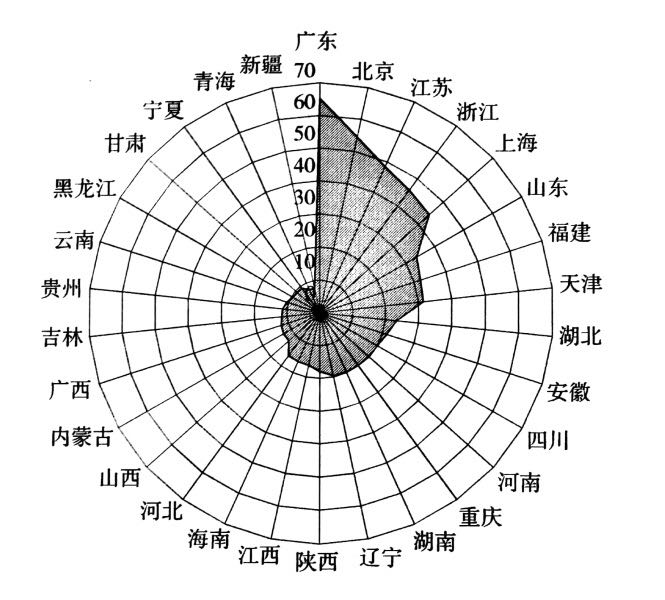 就四大区域而言,总体态势是东部地区新经济竞争力最强,其次为中部地区,再次为东北地区,西部地区最弱。分项考察,部分指标与总体指标的区域排位有所差异,有的指标西部地区超过东北地区,如数字化方面西部地区就高于东北地区,部分指标东北地区超过中部地区,如全球化、网络化方面,东北地区就超过了中部地区。而与东部地区相比,中、西部地区及东北地区各项指标都处于劣势。