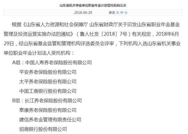 2018年6月29日,山东人力资源和社会保障厅也发布了《山东省机关事业单位职业年金计划受托机构公示》。