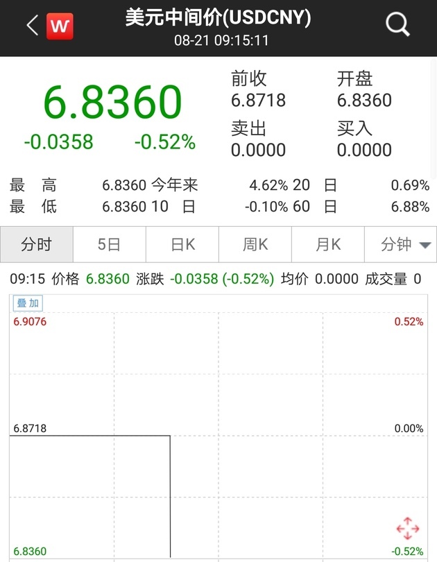 8月21日,人民币兑美元中间价6.8360,较上一交易日中间价6.8718上调358点。