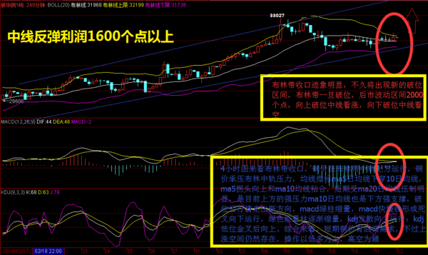 再来看看原油和铜行情,纵观近两个月的行情,在日线MA60日均线向下的时候原油点位一路下跌,最低更是打破了近十年的新低,每次打破新低都有少许的反弹,但是近一个月的行情就做出了一个质的改变,这完全不仅仅只是反弹了,从2月18日原油交割导致高开之后,高开缺口没有得到填补之后,原油价格一路上冲,不断打破近期新高,并且目前原油点位已经打破了去年12月份以来的新高,日线MA60日均线走平并有拐头向上的趋势,所以在后市的行情里面本人看涨,中长线看30个点利润,上破新高可能会有回调,这属于正常走势。本人建议中长线夹杂短线同时操作,简单的说,中长线单子打持久战,短线获取短线回调利润,本人预期下周一原油会回调到245一线然后冲高,在245一线可布局中长线多单,目标看285一线,上方压力位分别位于253,265,272,278,285,每次在压力位处5分之一仓位进空单,看4个点即可,多单就继续持有。