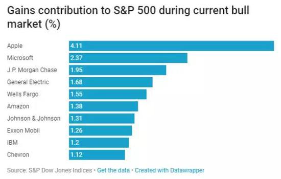 据标普道琼斯(25733.5996, -88.69, -0.34%)指数数据,自2009年3月9日以来,仅苹果一家公司就为标普500指数的走牛贡献了4.11%。排在之后的依次为微软(107.06, 1.08, 1.02%)(2.37%)、摩根大通(114.97, -0.35, -0.30%)(1.95%)、通用电气(12.47, -0.16, -1.27%)(1.68%)、富国银行(59.17, 0.21, 0.36%)(1.55%)、和亚马逊(1.38%)等。