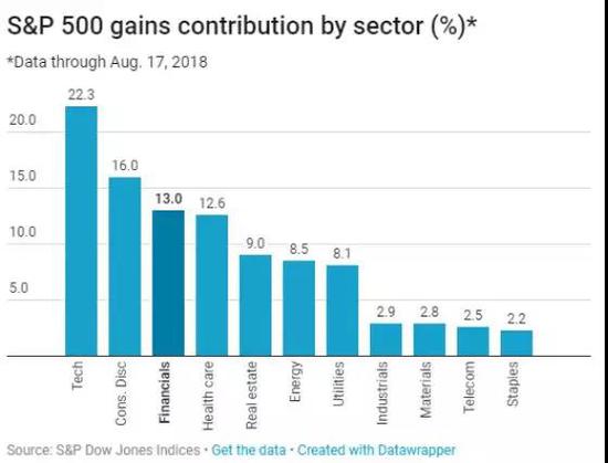 行业层面,科技股毋庸置疑是本轮美股牛市的最大贡献者,该板块为标普500的走牛贡献了22.3%的涨幅,其次为消费品(16%)、金融(13%)和医疗保健(12.6%)等。