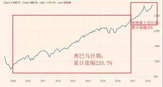 记者计算得出,在奥巴马任期的八年内,标普500指数累积上涨235.7%%,从676点涨到了2271点;而在特朗普上任的这近一年半的时间内,标普500的涨幅仅为26%,从2271点涨到了2863点。