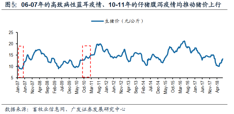 国内可以参考的是疫情最近是分别是2006—2007年的蓝耳病,以及2010—2011年的仔猪腹泻疫情。疫情结束后,生猪供给相对不足,猪价实现快速上行 。