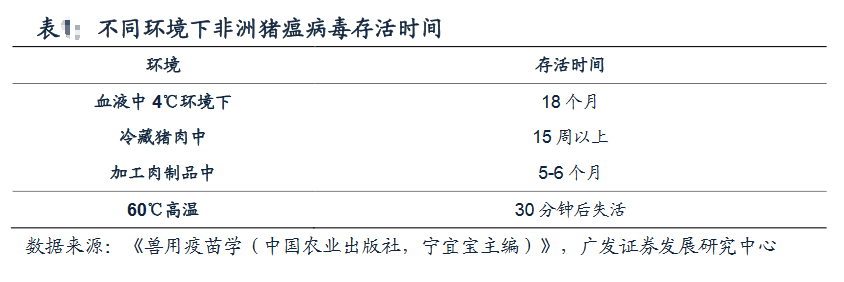 非洲猪瘟病毒对外界环境适应性强,血液中病毒可在 4 °C环境下存活 1 8 个月 , 在 冷藏猪肉中存活 1 5 周以上 ; 在加工肉制品中存活 5 - 6 个月 。 6 0° 高温 3 0 分钟后可灭活 病毒 。 由于目前尚无疫苗可用于非洲猪瘟预防 , 且感染后康复猪只仍带毒 , 会导致 亚急性及慢性感染增多 , 因此目前全球应对非洲猪瘟的方式是扑杀和无害化处理 。