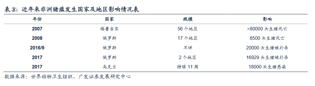 非洲猪瘟最早于 1921 年爆发在非洲肯尼亚,由于和典型猪瘟(CSFV, RNA 病 毒症状相似所以必须经专业实验室确诊 。1957 年非洲猪瘟第一次传播到非洲以外 的地区 —— 葡萄牙,原因是里斯本机场附近的一家养殖场使用飞机上的食物垃圾作 为饲料造成非洲猪瘟感染,虽然疫情很快就被控制住,但是不久之后的 1960 年非洲 猪瘟再次在里斯本爆发。并且长期在伊比利亚半岛(葡萄牙和西班牙)流行,一直延续到上世纪九十年代。