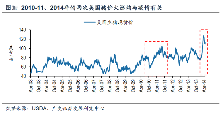 国外方面,美国2010—2011年,以及2013—2014年爆发的疫情,都导致猪肉价格明显上涨。