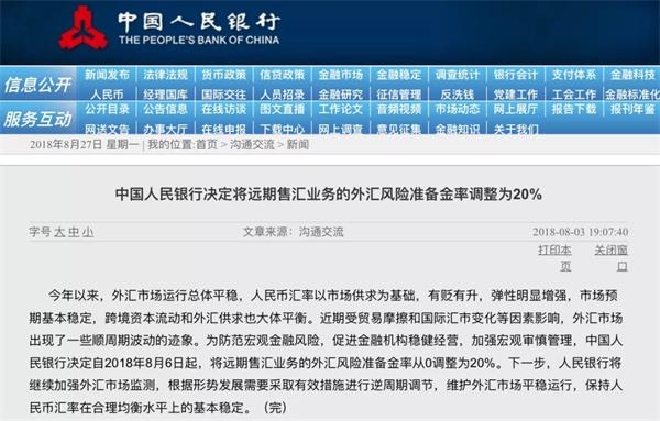 除这两项举措之外,人民银行还于8月3日宣布,自本月6日起,将远期售汇业务的外汇风险准备金率从0调整为20%。
