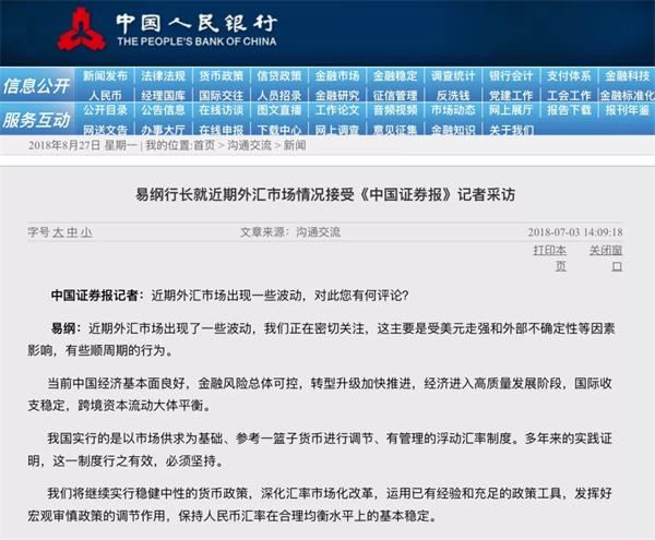 2018年7月3日,易纲行长在接受《中国证券报》记者采访时称“近期外汇市场出现了一些波动,我们正在密切关注,这主要是受美元走强和外部不确定性等因素影响,有些顺周期的行为。”