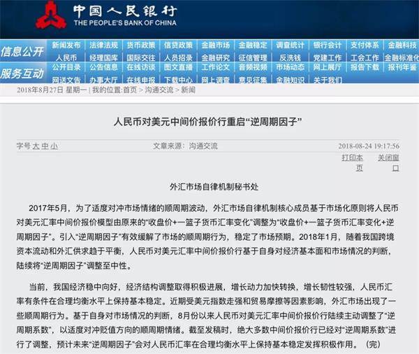 8月24日19时,外汇市场自律机制秘书处发布新闻稿称,人民币对美元中间价报价行重启“逆周期因子”。10分钟后,央行网站转发了该条新闻稿。