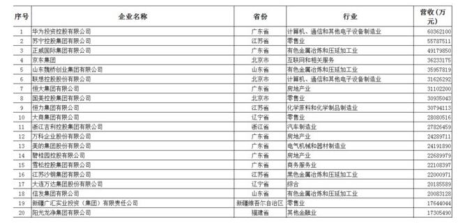 8月29日,全国工商联在辽宁发布2018年民营企业500强报告,华为技术有限公司以6036.21亿元的营业收入蝉联民营企业500强榜首,苏宁控股、正威国际,京东和山东魏桥排名二到五位。