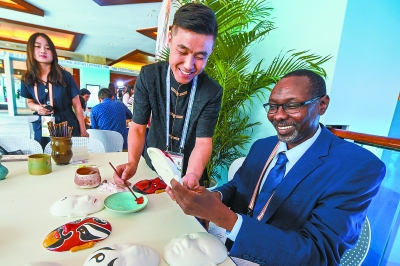 画脸谱、做团扇、做彩塑……在2018年中非合作论坛北京峰会新闻中心,非遗文化体验互动区成为工作区外最热闹的区域,中外记者们在工作之余,也纷纷前来体验中国非遗文化,学习制作手工艺品。在峰会开幕之前,体验区光生肖彩塑就已经诞生上百件作品。