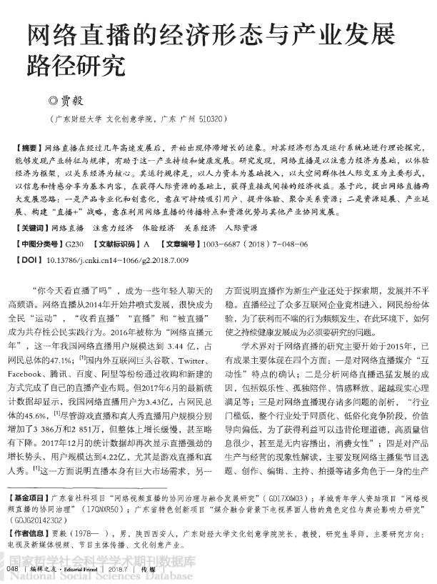 【摘要】网络直播在经过几年高速发展后,开始出现停滞增长的迹象。对其经济形态及运行系统地进行理论探究,能够发现产业特征与规律,有助于这一产业持续和健康发展。研究发现,网络直播是以注意力经济为基础,以体验经济为框架,以关系经济为核心。其运行规律是,以人力资本为基础投入,以大空间群体性人际交互为主要形式,以信息和情感分享为基本内容,在获得人际资源的基础上,获得直接或间接的经济收益。基于此,提出网络直播两大发展思路:一是产品专业化和创意化,意在可持续吸引用户、提升体验、聚合关系资源;二是资源延展、产业延展、构建"直播+"战略,意在利用网络直播的传播特点和资源优势与其他产业协同发展。