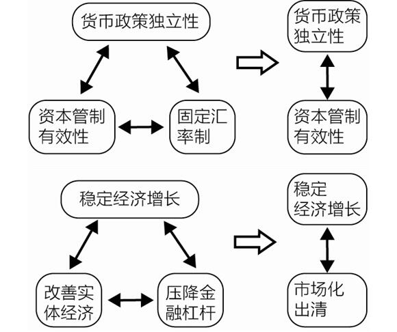 在国际经济学当中,有一个著名的“不可能三角”,即政府不太可能同时兼顾货币政策独立性、资本管制和固定汇率制这三个目标,只能三者取其二,这通常被称为蒙代尔三角或者克鲁格曼三角,或者说,从政策可置信和可持续角度观察,我们只能选择角端解,难以选择中间解。新近有研究者指出,考虑到国际金融周期,传统的不可能三角将被“二元悖论”所取代,即无论选择怎样的汇率制度,一国央行不可能兼顾货币政策独立性和有效的资本管制。