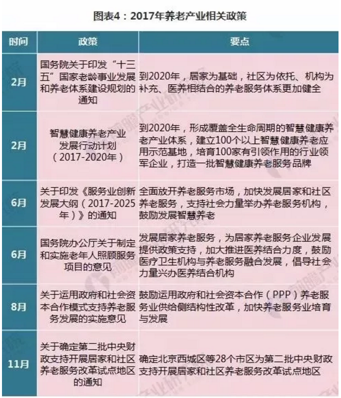 近年来,养老行业政策密集发布,2017年出台的养老相关政策如下图所示。其中,工业和信息化部民政部国家卫生计生委发布的《智慧健康养老产业发展行动计划(2017年-2020年)》在制定计划同时还提出,要利用物联网、云计算、大数据、智能硬件等新一代信息技术产品,能够实现个人、家庭、社区、机构与健康养老资源的有效对接和优化配置,提升健康养老服务质量效率水平。