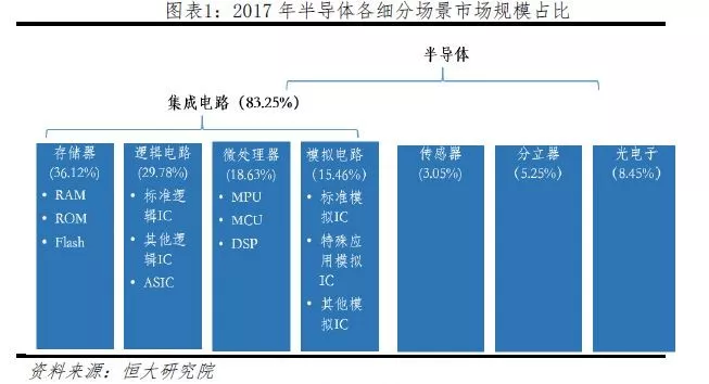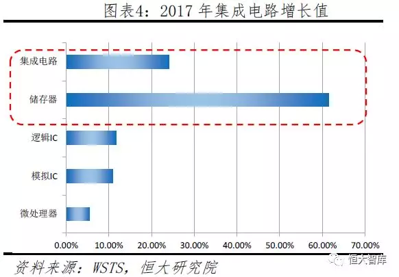从整体来看,根据世界半导体贸易协会(WSTS)数据显示,2017年全球半导体市场销售额达4122亿美金,同比增长21.6%,背后主要推动力来自集成电路与传感器的强力增长:得益于DRAM(动态随机存取储存器)、NAND闪存等储存器爆发,集成电路2017年增速为24.03%;因物联网、智能控制、汽车应用、图像识别等强劲需求驱动,传感器市场去年增速为16.17%。