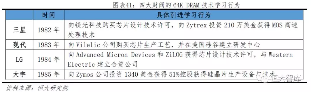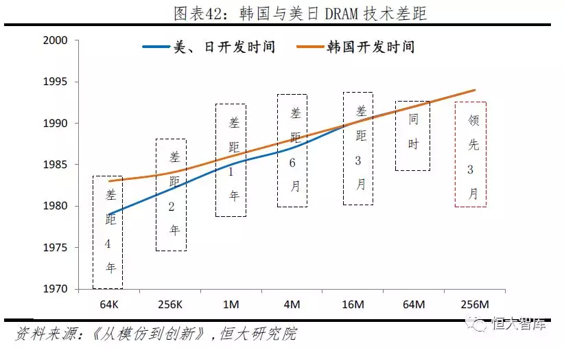 在归国教授姜基东带领下,韩国拥有了16K DRAM生产技术,但是基础依旧薄弱,想要继续研制64K DRAM非常困难,这决定了韩国无法自主生产需要借助外力。通过向美国购买技术、设备、海外学习并建立实验室,韩国4年内就实现64K技术跨越。之后将相同战略复制到256K、1M生产中,逐渐缩小与日本的差距。