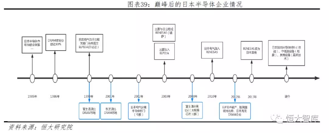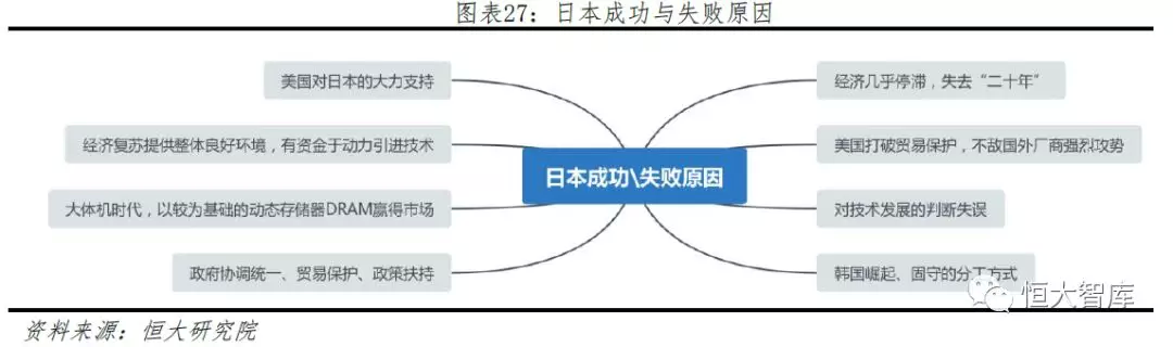 日本半导体1986年DRAM市场占有率达80%反超美国成为世界半导体第一强国。成功在于1)初期美国的大力支持与经济复苏;2)大型机时代以“物美价廉”从DRAM市场切入赶超;3)政府在协调统一与贸易保护做出的巨大贡献。但90年代开始逐渐没落,主要因为1)经济几乎停滞,同时美国打破贸易保护;2)固守大型机时代的成功,没有根据行业发展进行主动调整,失去先机;3)固守的分工方式,在人力与资金上显得累赘,缺乏灵活性。