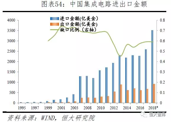 中国集成电路发展势头凶猛,第三次产业转移趋向中国。据数据统计,2017年我国集成电路产业销售额达5411.3亿人民币,同比增长24.81%。产业结构从“大封测-中制造-小设计”到“大设计-中封测-中制造”转型,从低端走向高端,展现我国集成电路发展的突破。但我国需求供给不平衡不匹配现象仍然严重,且将长期存在。进出口缺口比例长期保持50%以上,其中进口项目45%以上为微处理器与控制器,说明我国在核心芯片缺乏核心竞争力,需要依赖于人。