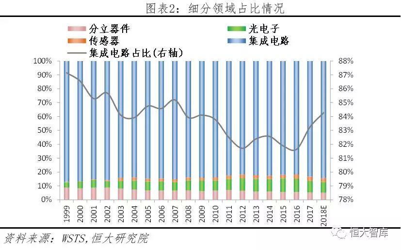 从类型来看,半导体可以分为集成电路、光电子、分立器件和传感器这四大类。尽管占比有下滑趋势,集成电路依旧以超80%市场份额领跑,细分包括储存器(36.12%)、逻辑电路(29.78%)、模拟电路(15.46%)和微处理器(18.63%)。