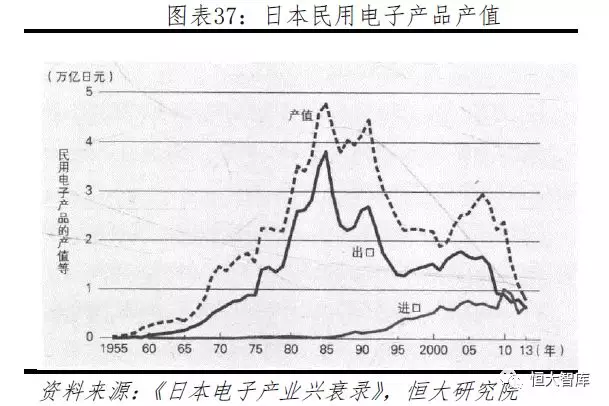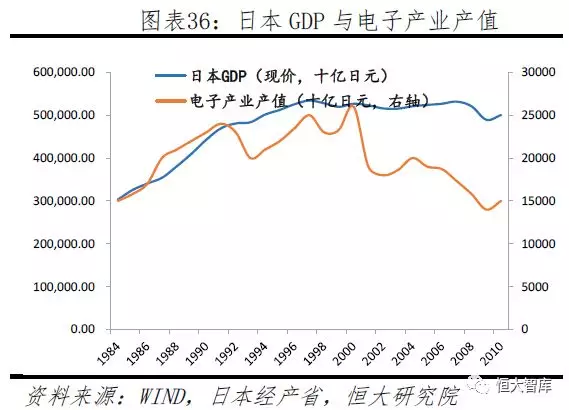 到达巅峰之后的日本并没有延续辉煌,而是渐渐江河日下。首先,作为强力支持的整体经济,受到亚洲金融风暴与日本经济泡沫影响,在1998年后开始出现负增长。其次,失去主权与美国签订的双边协议影响逐渐凸显。第一,《广场协议》推高日元降低美金,从1985年后的几年内,美日汇率从240日元降低到120日元,令日本出口优势不再。第二是美日半导体双边协议的作用,从电子产业产值变化曲线可以看出,第一次受到明显影响在1993年,正是美国夺回第一的次年。在美国切断技术支援与强势打开市场双重药剂下,日本电子产品出口值从1985年开始快速下降,到2000年电子产品出口值约1.5万亿日元,不及1985年峰值的一半。
