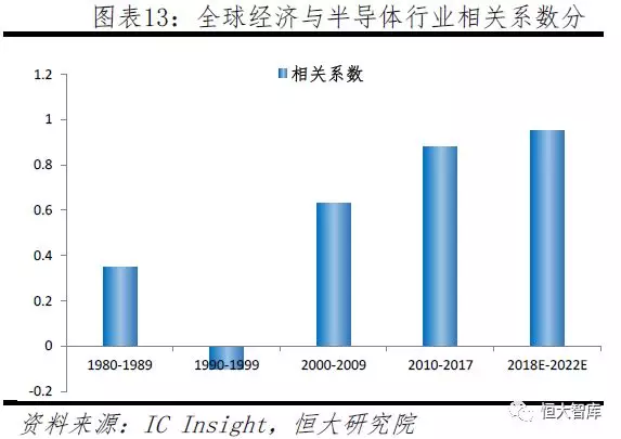 作为资金与技术高度密集行业,半导体目前形成深化的专业分工、细分领域高度集中的特点,因此半导体受全球经济影响波动较大,且相关性越来越强。分析1980-2022年期间全球经济与半导体行业之间的相关系数可以发现,除去90年代全球半导体行业处于整合模式向垂直加工模式转移,其他期间显示出全球经济对半导体行业强力拉动关系,而这一趋势未来表现更甚,相关系数逐渐向1靠拢。主要原因为两点: