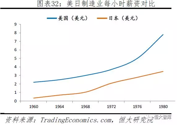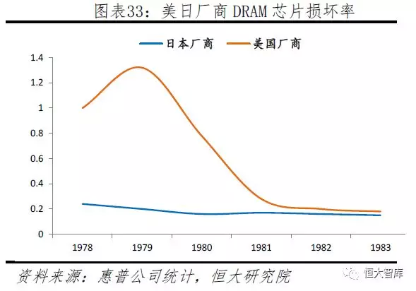 经过十多年的铺垫,日本制造能力完成从“价廉物劣”到“价廉物美”转型,并依靠廉价劳动力获取大部分海外市场。从惠普公司1983年发布的一项DRAM芯片调查发现,1980年前日本芯片良品率是美国同等产品的5倍。与此同时,日本1960-1980年制造业平均小时工资为1.73美金而美国为3.8美金,日本仅为美国的约45%。