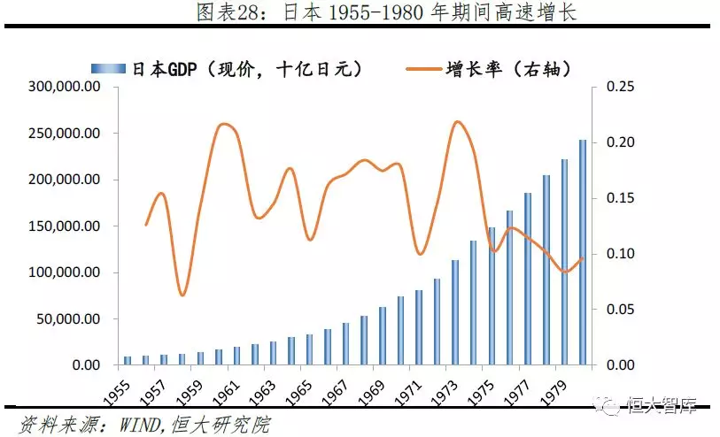 初期,即20世纪50年代至60年代,日本的发展离不开美国的支持,主要体现在经济复苏与技术授权。20世纪50年代,美国爆发对朝鲜战争,军需大大提高,作为美国“远东兵工厂”的日本凭借此次机会,迅速积累技术与财富,修复二战后科技与经济落后的差距。此后的美苏争霸,日本再次充当美国背后支持储备角色,支援的同时靠着美国提供的工业技术,充实自身基础,家电行业的腾飞也正是这些行为的结果。日本从“军转民”正式进入经济高速发展阶段,GDP在1955-1980年期间保持超10%增速增长,这不过花费约10年。