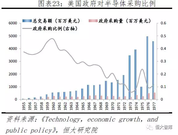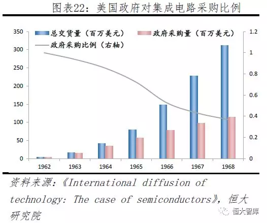 再者,政府的资金支持与大规模采购加快技术发展与产品商业化,其中空军支持率最高。研发经费分政府经费与民间经费,政府经费又分直接拨款与承包合同两种主要形式,而承包合同贡献率更强。据美国商务部数据统计,1958-1964年期间,平均每年研发经费来自政府的比例约85%(除1956年),1958年政府直接拨款400万美金,承包合同费用则高达990万美金。集成电路发明后的六年内,政府对其资助达3200万美金,70%来自空军。合作内容包括德州仪器115万美金的两年半的技术研发、德州仪器210万美金的500个集成电路生产能力、西屋公司的430万美金的电子产品生产等。在产品得到初步回报后,政府降低采购与资金力度,转接给个人与企业投资者,再借助市场效应扩大规模。