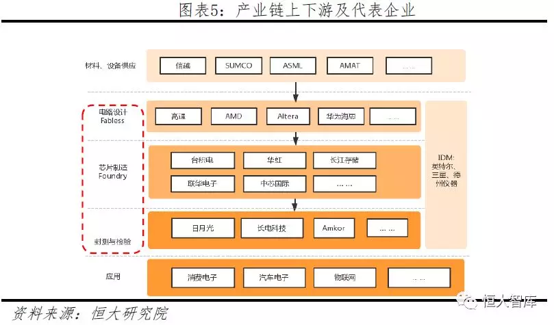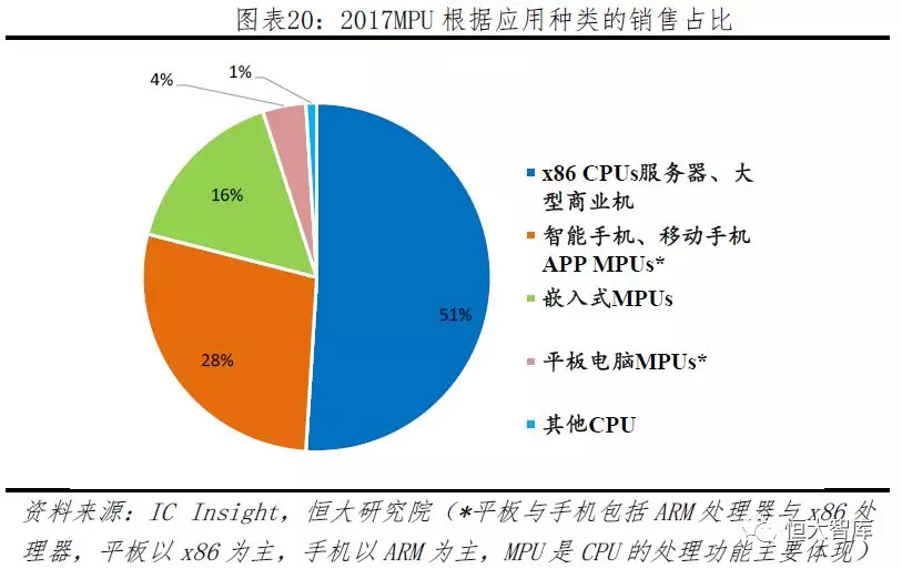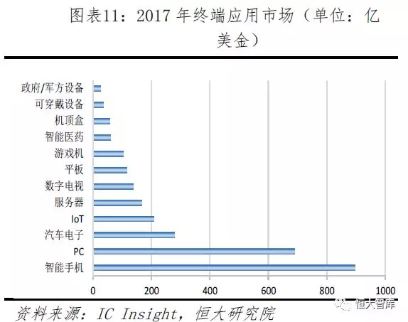 因为拥有英特尔、三星、海力士等全球前十公司,IDM市场规模远大于Fabless市场规模,但两者差距逐渐缩小。Fabless与IDM规模比从1999年的7.67%提升到2017年的38.66%,说明行业产业链全球纵向延伸加剧。终端应用方面,智能手机依旧是第一大场景,占整体32.28%。虽然智能手机市场逐渐饱和,出货量连续下滑,智能手机市场对半导体需求依然保持较高水平。另外,5G、人工智能、物联网、汽车电子等快速发展也大力度推动整个半导体芯片市场。